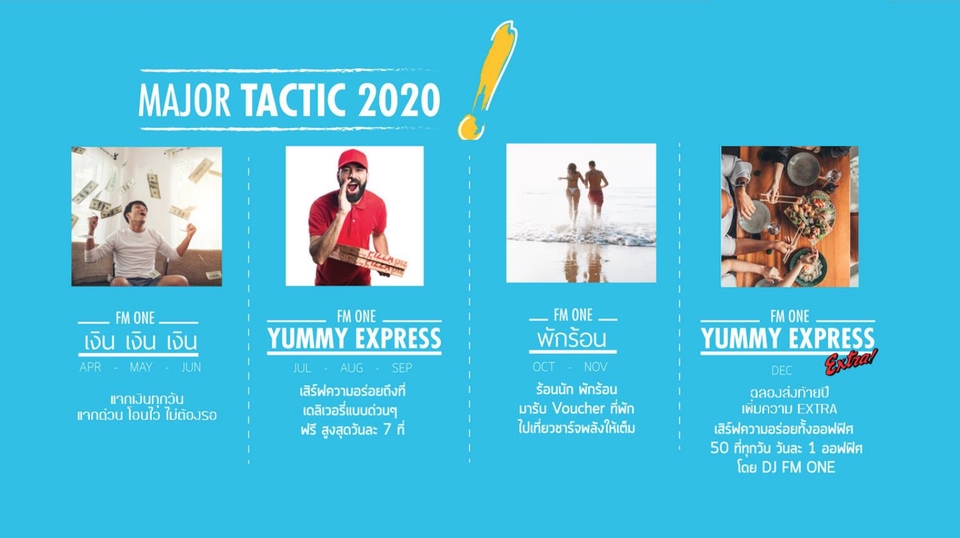 | รายละเอียด Package | Presentation 1 ฉบับ สำหรับนำเสนอครีเอทีฟไอเดียกิจกรรมในรายการวิทยุหรือโทรทัศน์ (ON AIR) พร้อมรายละเอียดการวางกลยุทธ์ต่าง ๆ | Presentation 1 ฉบับ สำหรับนำเสนอครีเอทีฟไอเดียรูปแบบรายการหรือกิจกรรมออนไลน์ (ONLINE) พร้อมรายละเอียดการวางกลยุทธ์ต่าง ๆ | Presentation 1 ฉบับ สำหรับนำเสนอครีเอทีฟไอเดียรูปแบบงานอีเวนต์ต่าง ๆ / ทริปท่องเที่ยว / Road Show / Workshop (ON GROUND EVENT) พร้อมรายละเอียดการวางกลยุทธ์ต่าง ๆ |