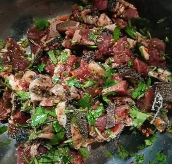 น้ำพริกลาบปรุงสำเร็จ ฉีกซองพร้อมเติมเนื้อสัตว์ลงไป คลุกเคล้าให้เข้ากัน
