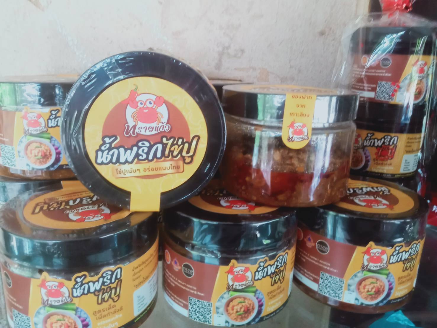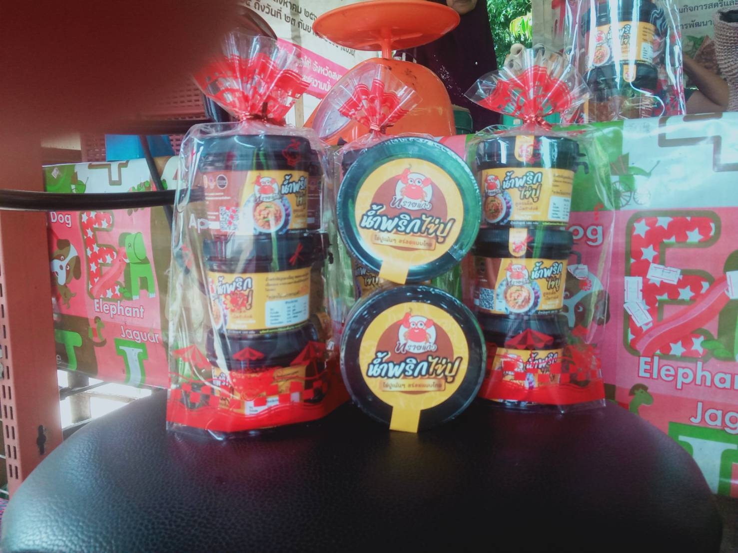 น้ำพริกไข่ปู น้ำพริกเนื้อปู ปลาอิทรีย์แดดเดียว ปลาเค็ม และเครื่องแกงตำมือ