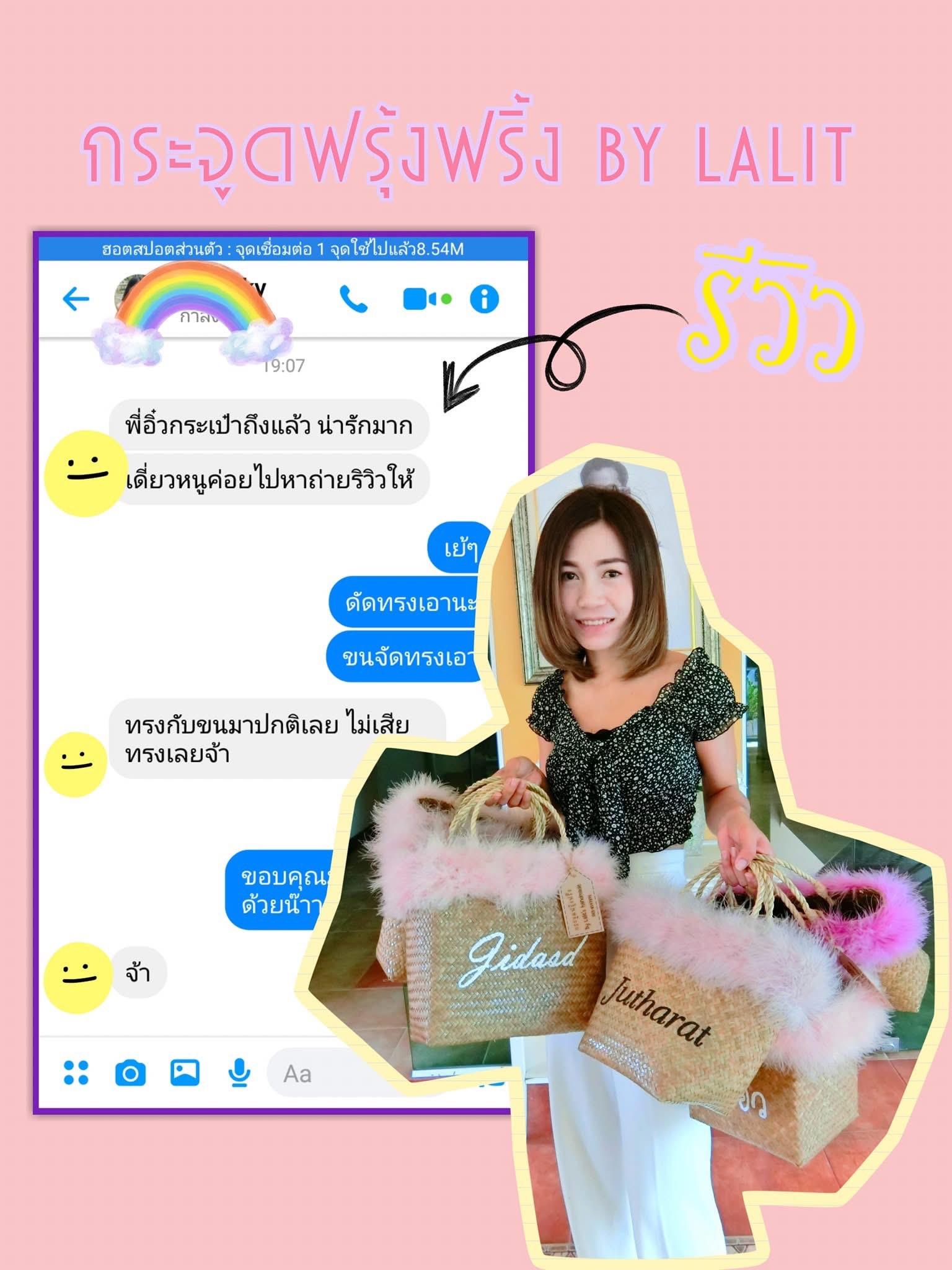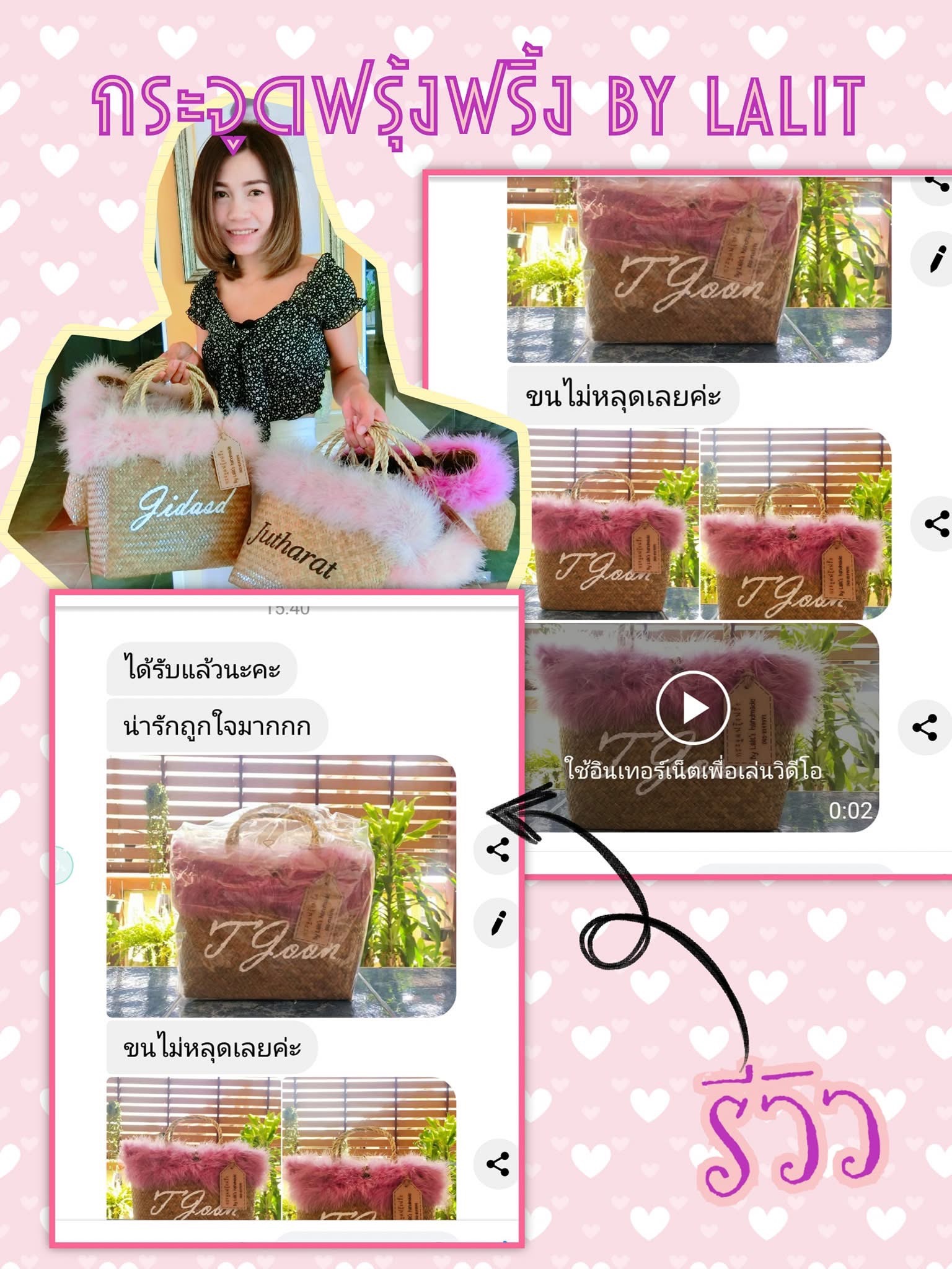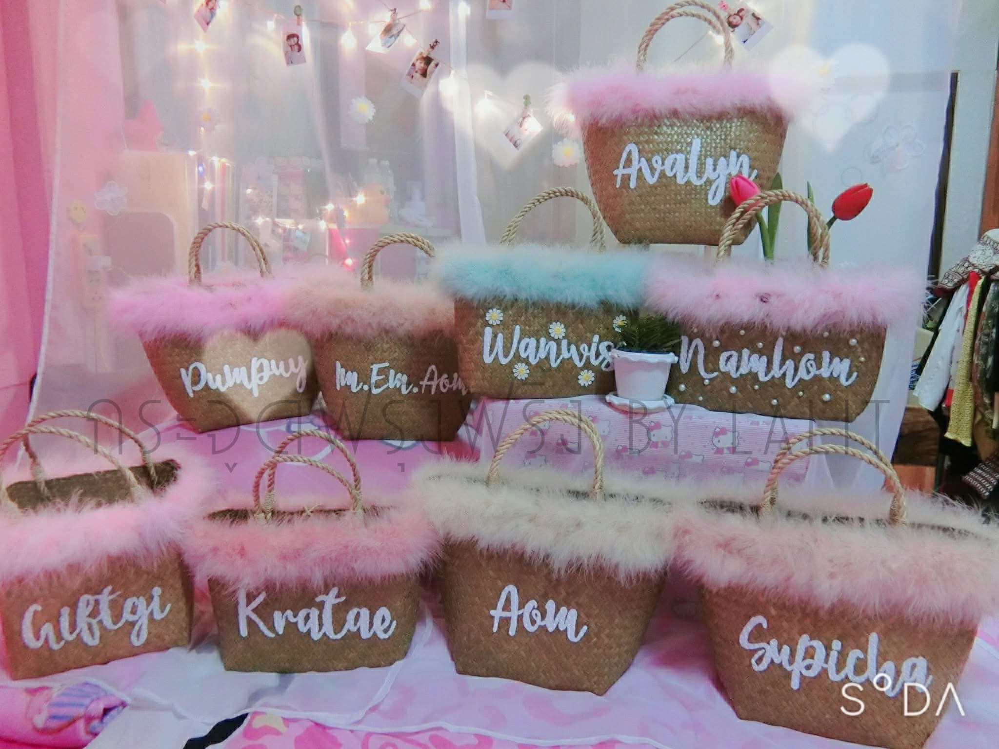 กระเป๋าสานตกแต่งขนฟูฟรุ้งฟริ้ง เพิ่มความเก๋ด้วยการเพ้นท์ชื่อ (หรือคำที่อยากได้)